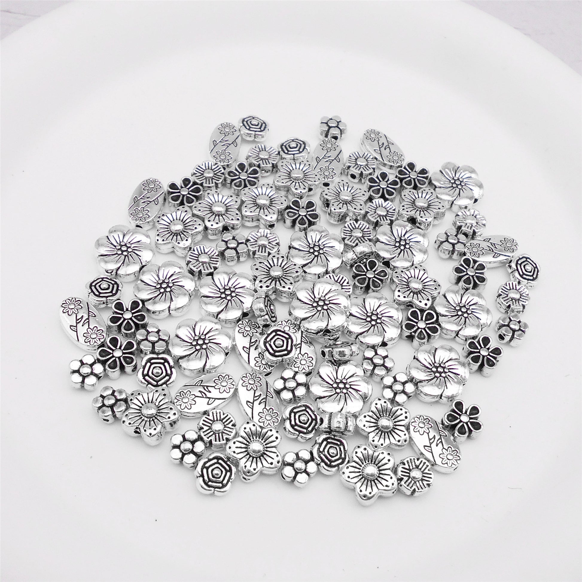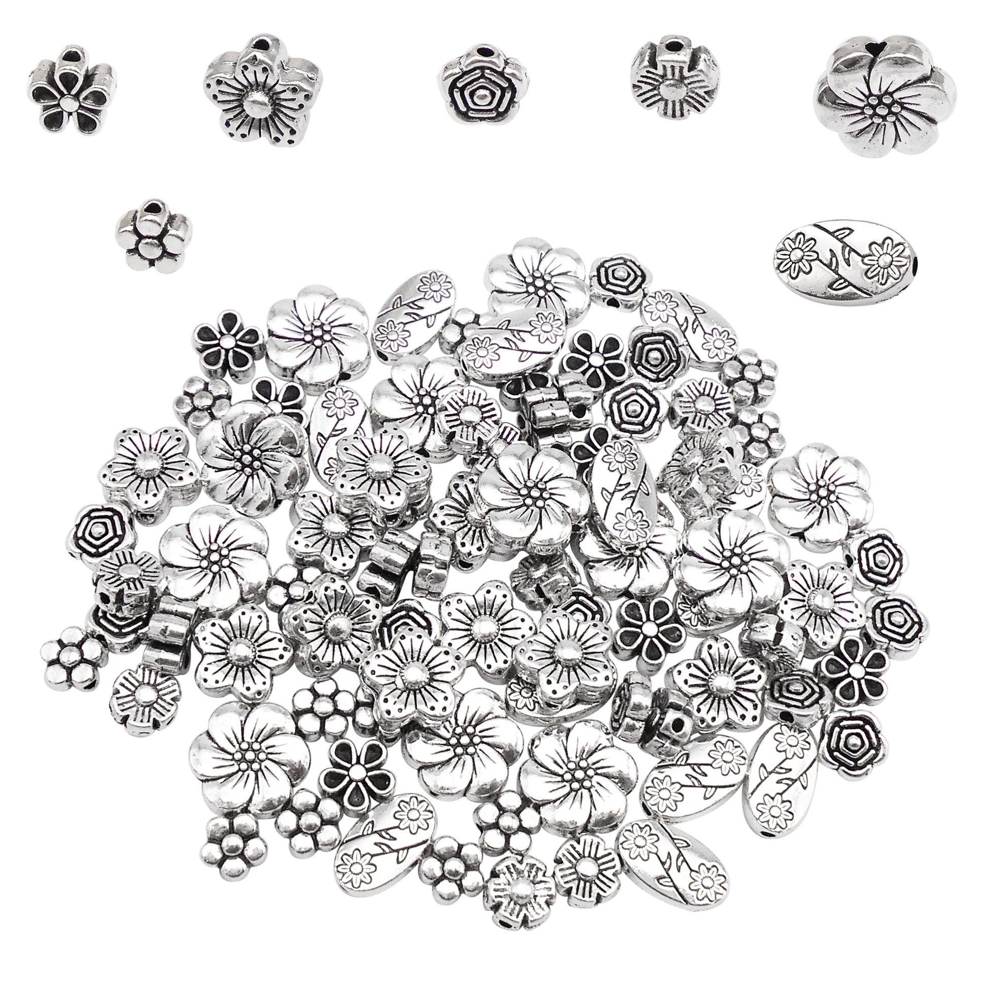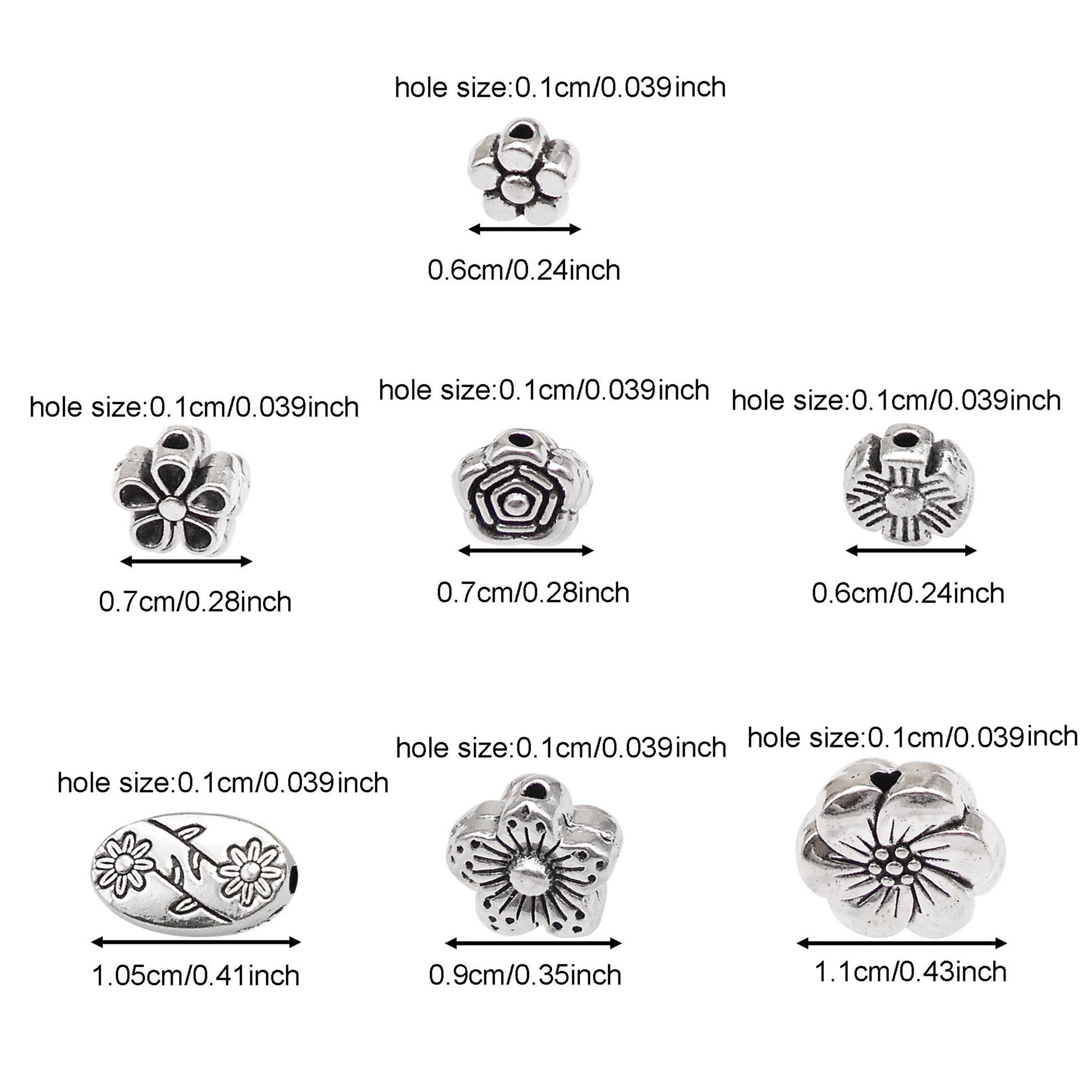 210PCS Mixed Alloy Antique Silver Spacer Beads Bulk Flower Loose Bead for Bracelets Necklaces Earrings Jewelry Making 7 Styles