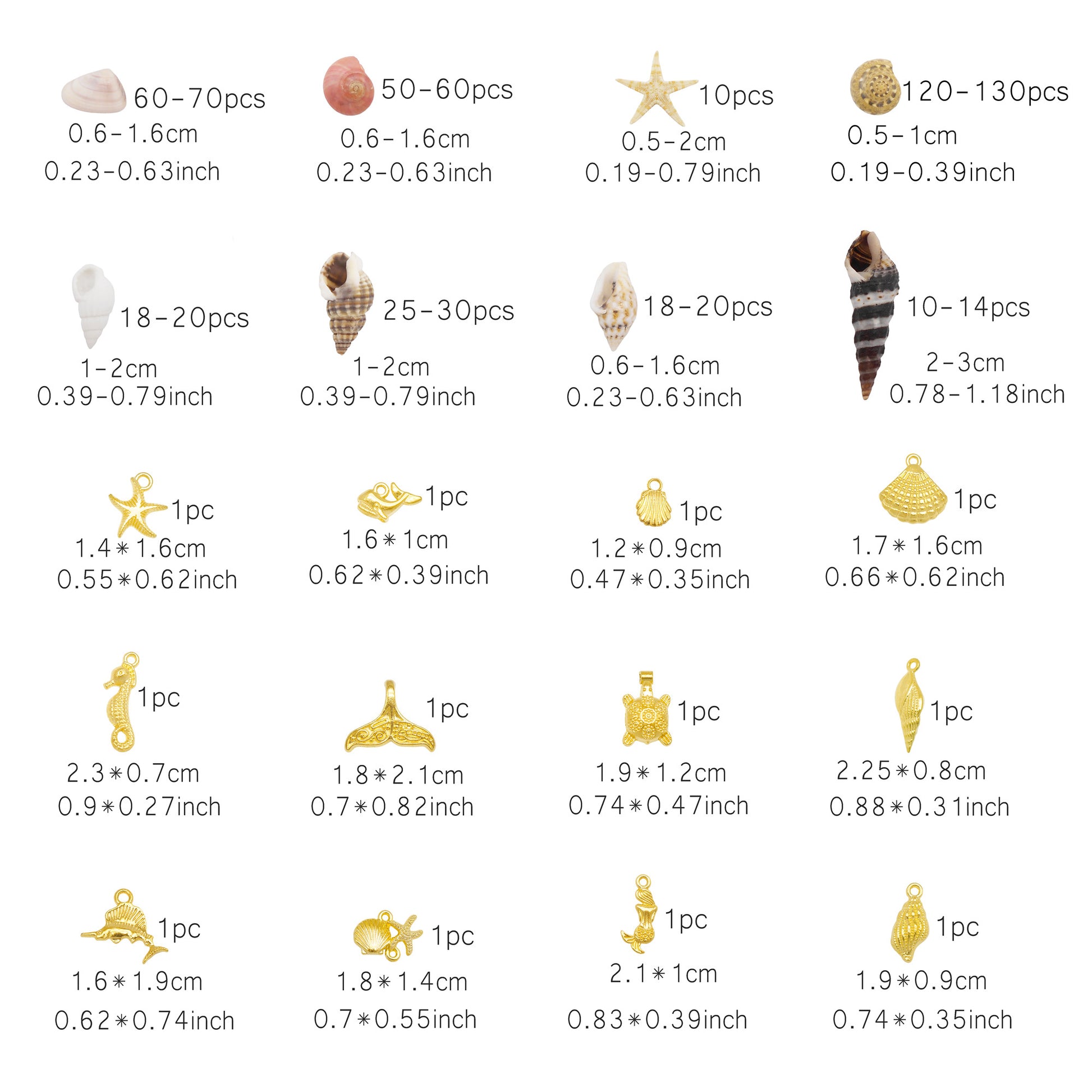 - Bulk Quantity: You will receive a total of 440-500 pieces (containing 10 pcs natural starfish, 12 kinds dfferent natural shells and 12 pcs gold color alloy charms), which are well packed in a plastic box