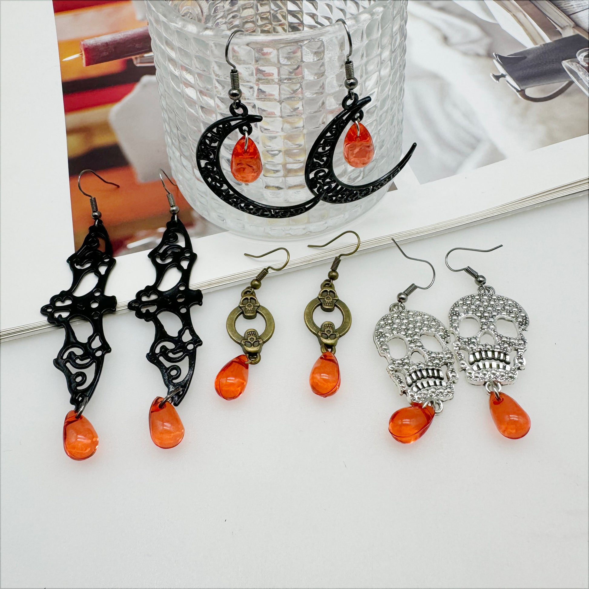 4Pairs Halloween Theme Alloy Earrings Openwork Bat Moon Ghost Head Dangle Hook Earring Women Ladies Hypoallergenic Ear Piercing Jewelry Festival Gift
